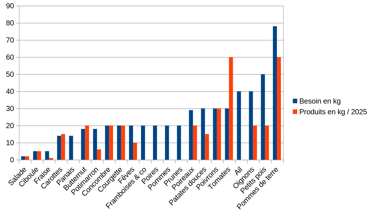 Et puisque quelques chiffres valent mieux que des mots, on maintient maintenant un petit tableau de production qu'on met en rapport avec nos besoins estimés, le tout en kilos. On ne plante QUE ce qu'on mange, et on mange & transforme TOUT ce qu'on arrive à produire. Le tableau et le graphique ci-dessous sont classés par besoins croissants :