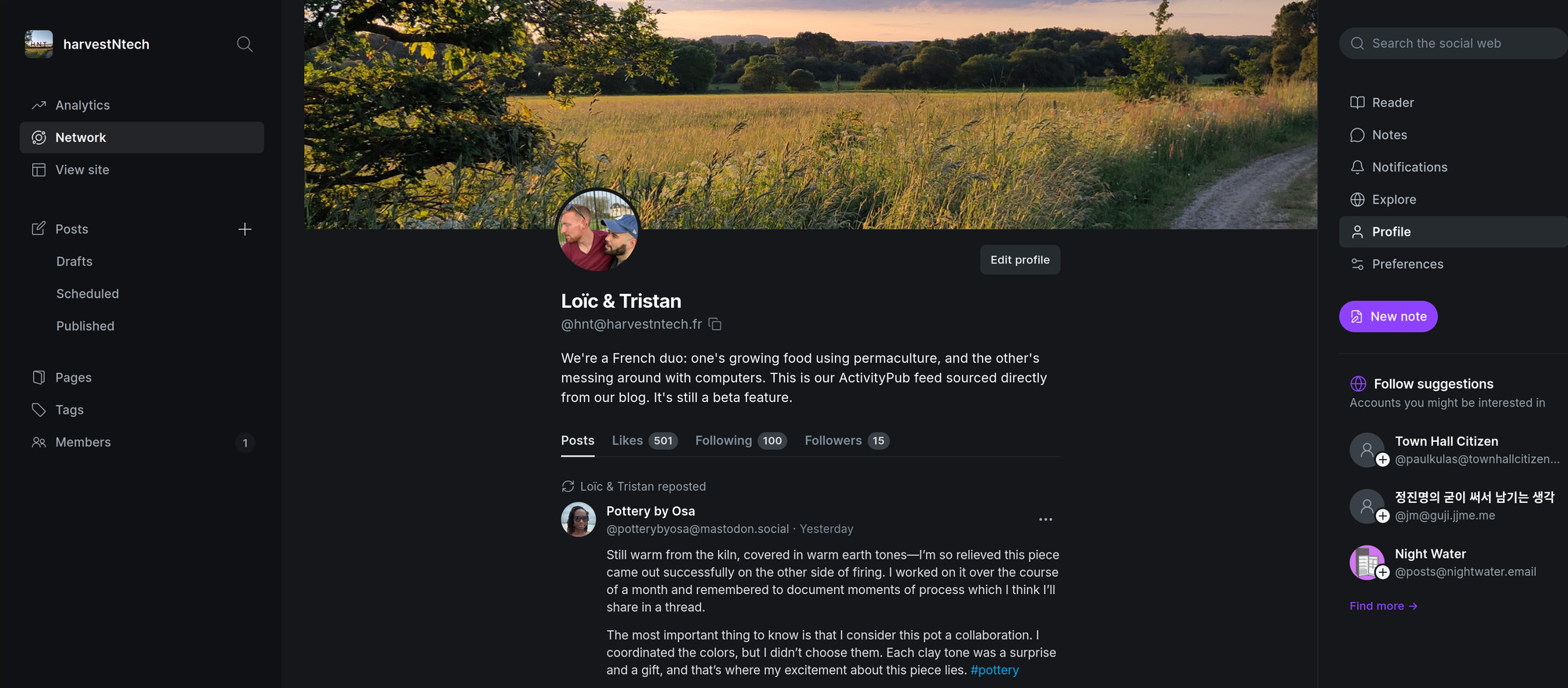 I told myself that this was THE solution to keep a single entry point to our shared harvestNtech universe while participating in the Social Web again. So I talked to Tristan, and we launched a brand new account, in both our names, which you can follow with your favorite federation application (Mastodon & co): @hnt@harvestntech.fr
