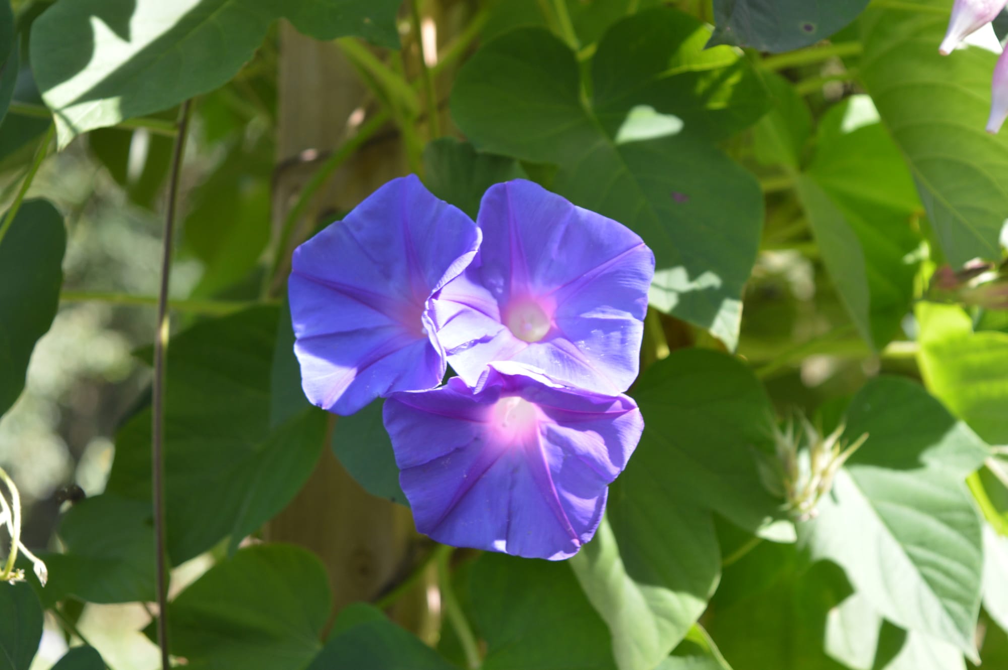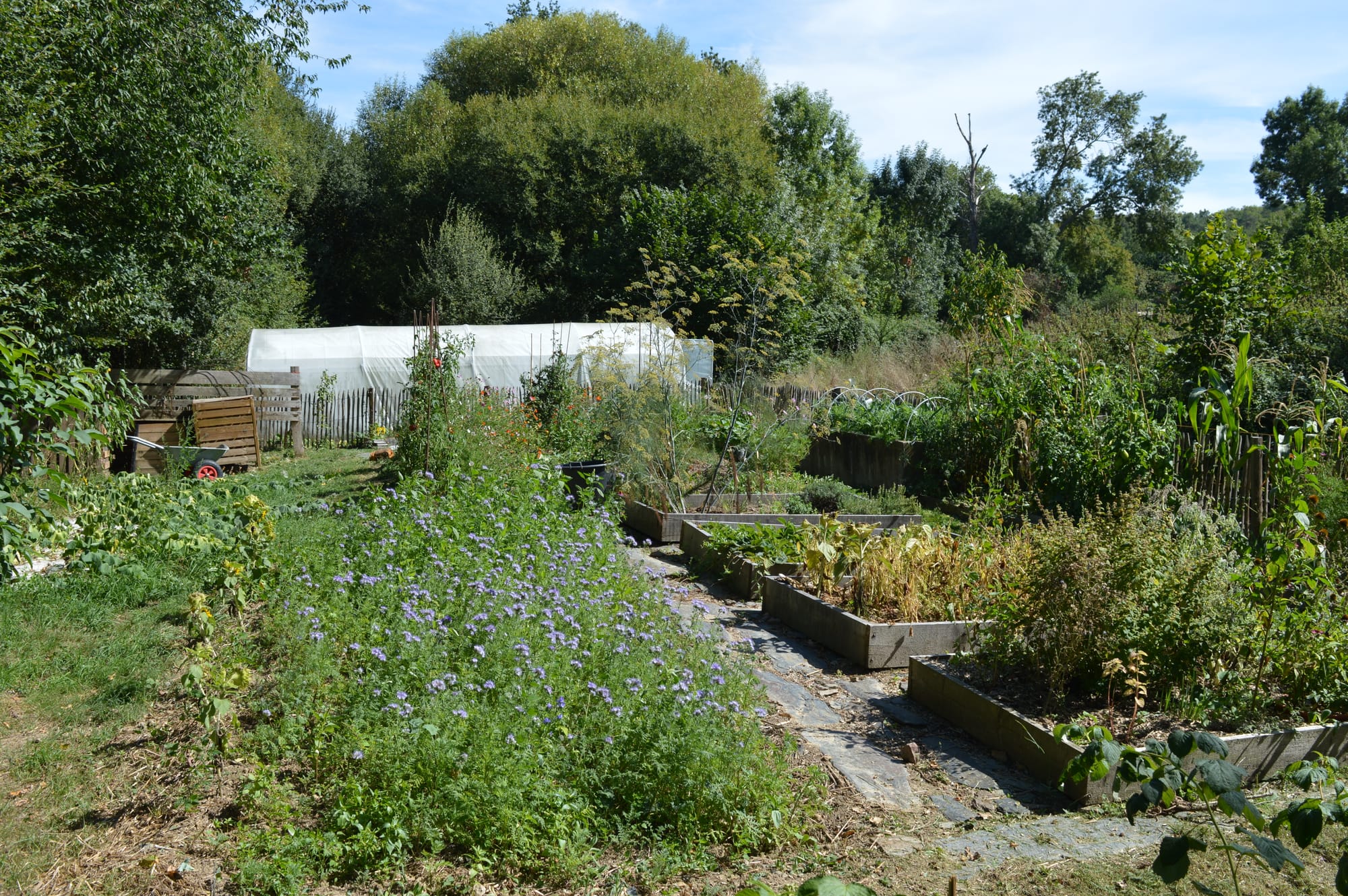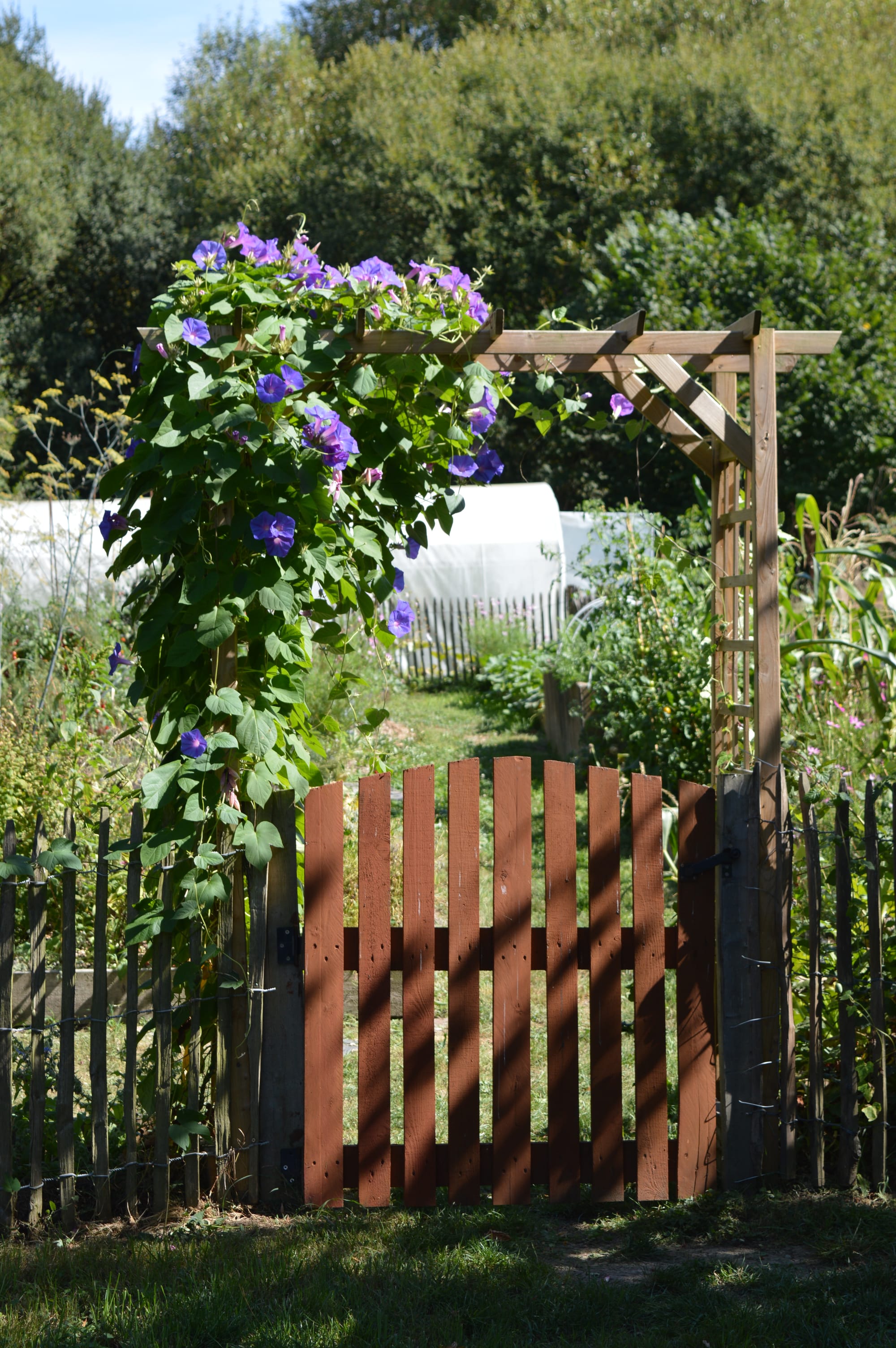L'entrée du potager avec l'ipomée en fleur ; une vue du potager avec le carré des pommes de terre remplacées par un champs de phacélie ; Tristan récolte des tomates cerises jaunes