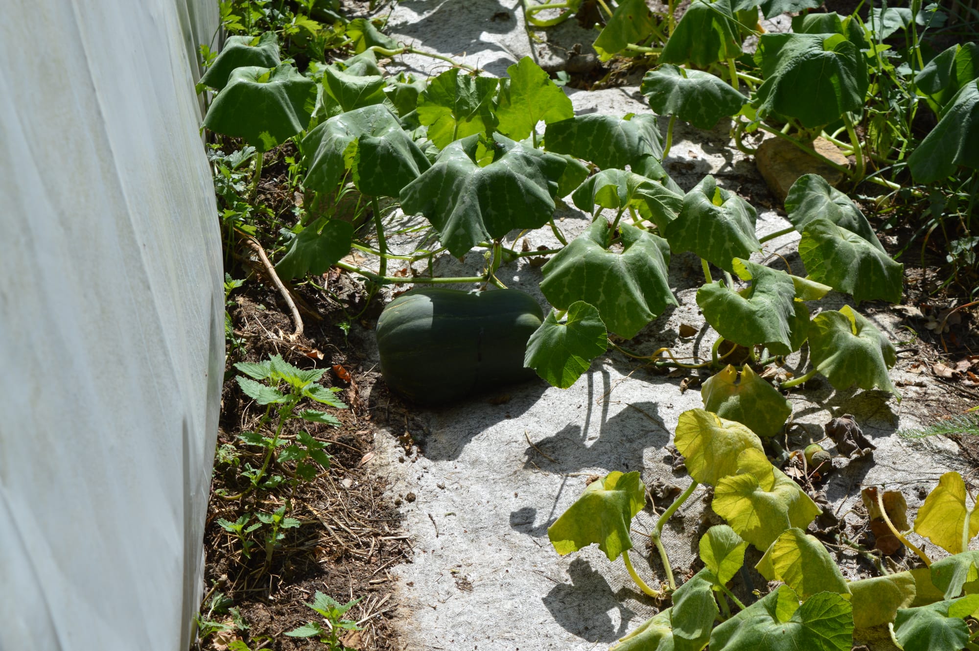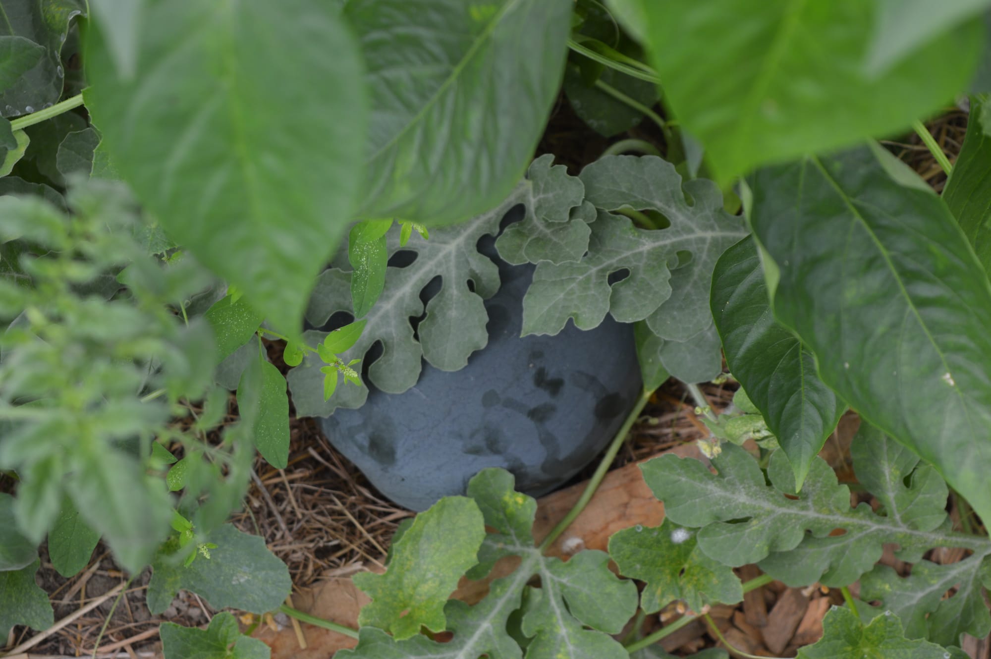 Un potiron ; une pastèque ; le carré des patates douces ; la ligne de poireaux
