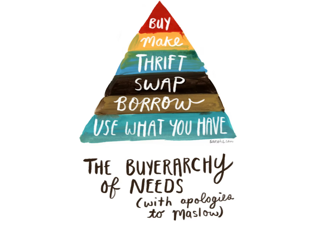 Since we’re only here on Earth for a brief period, it’s crucial that we cease contributing to waste production by advocating for Sarah Lazarovic’s ‘Buyerarchy of Needs’: our approach to material goods is to first repair and reuse what we already possess. If that’s not an option, we turn to borrowing and exchanging within our circle. After that, we look for second-hand items, and only as a very last resort do we purchase anything new.